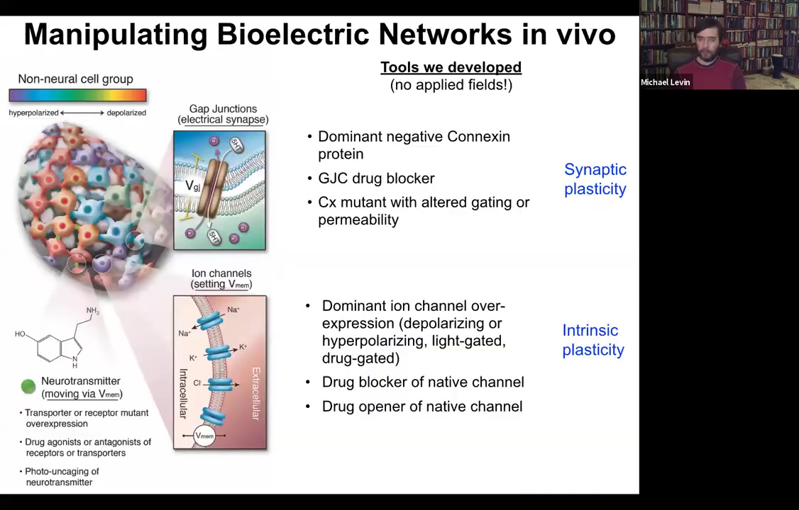 The way it works is you have two things you can control in any tissue. You can control which cells electrically couple to which other cells. We target these gap junctions. We can mutate them. We can open them, close them, controlling synaptic plasticity, or we can control the various ion channels, again opening and closing them, to actually set the voltage of the individual cells. This would be the equivalent of some sort of intrinsic plasticity if this was neuroscience. We can use dominant mutations of channels, we can use drugs, we can use optogenetics, light, and so on.