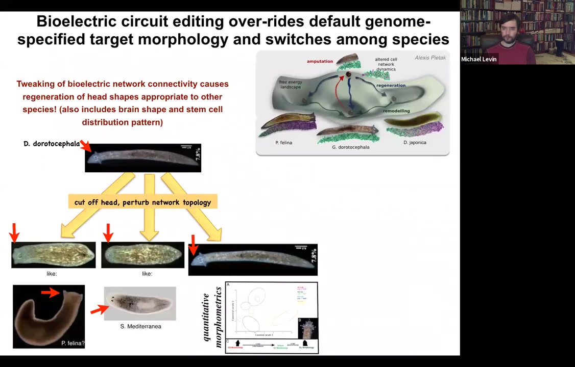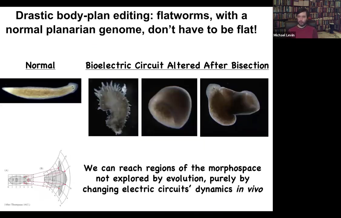 And you can really get far from the normal planarian shape. You can make animals that are spiky. You can make animals that are cylindrical, or a combination of a flat animal with a tube growing out into the third dimension. I'm going to show you in a minute that what this is all about is predictive control over large-scale anatomy. This is not about making weird, aberrant teratologies. The idea is that we can show how much of this is under bioelectrical control and then use computational techniques to gain good predictive control over it.