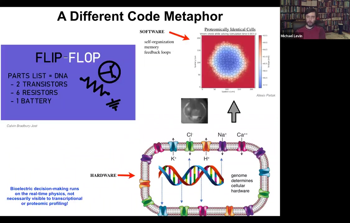 So in fact, with our modeling, you can see that the same thing is true if you set up a field of cells where every single cell is expressing exactly the same set of ion channels. What you actually make is an excitable tissue where very rich patterning can take place. It's a little like Turing patterns. There's spontaneous symmetry breaking and self-organization. But all of this happens with a completely constant proteome. You don't need to change these ion channels because they can open and close. And now all of the dynamics are at the electrical circuit level, not with the proteins underneath. The prediction of this way of thinking about it is this: you should be able to edit the software, meaning change the information stored in the system while keeping the hardware constant.