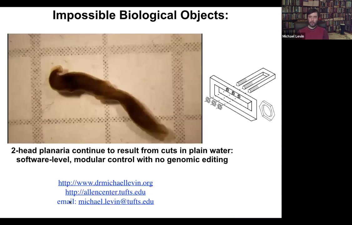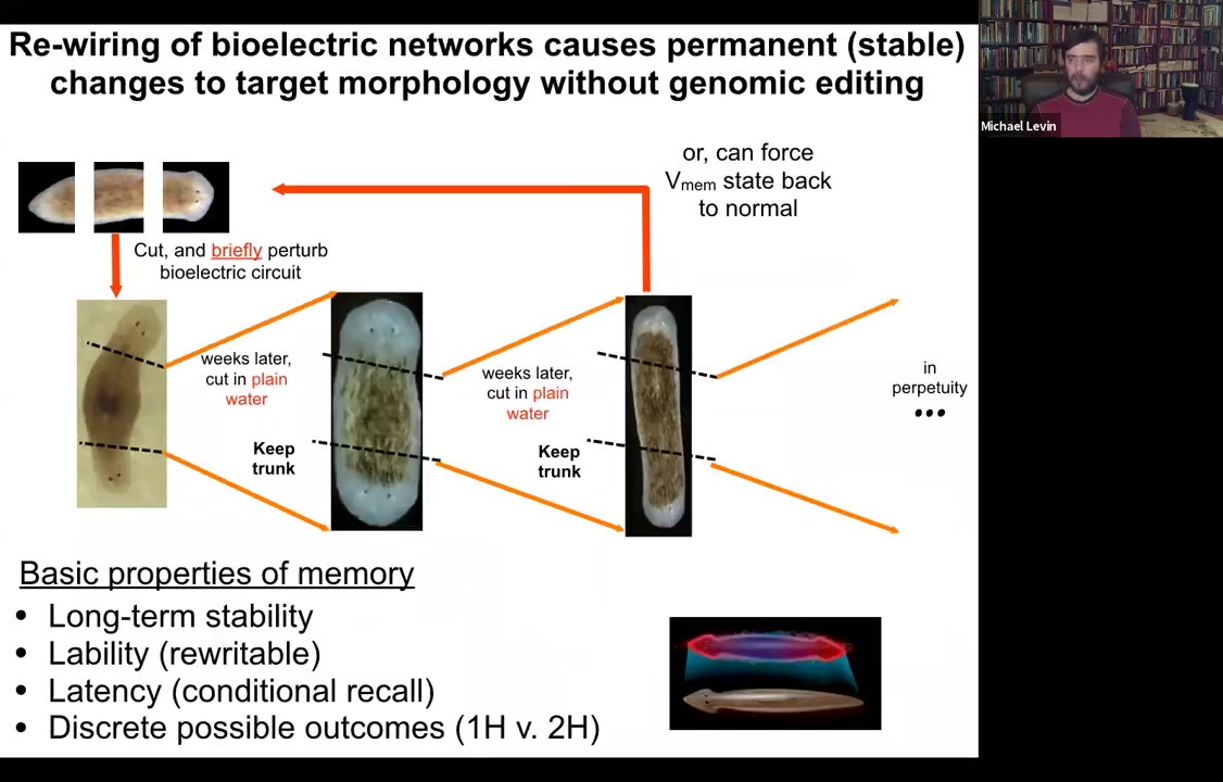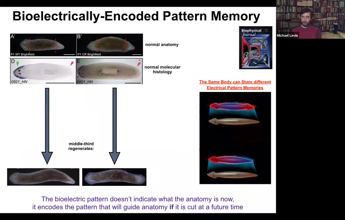And sure enough, that's exactly what happens. When you amputate these in perpetuity, as far as we can tell, forever, two-headed animals will continue to give rise to two-headed animals, even despite their wild-type genome in plain water, no more manipulation. And we can, in fact, if we want to, we can set the bioelectric circuit back to normal, and it goes back to being a single-headed animal. So a normal planarian body, as you're going to see, is able to store a couple of different, at least, probably more, but we've nailed down two, ideas of what a correct planarian is supposed to look like.