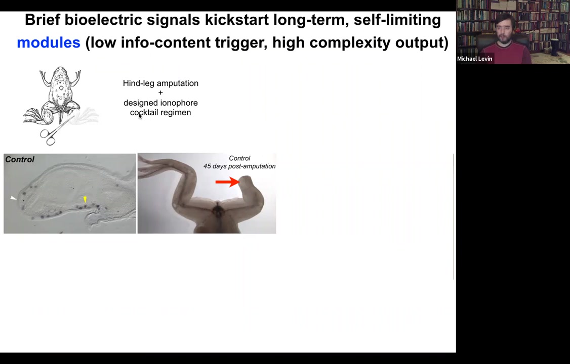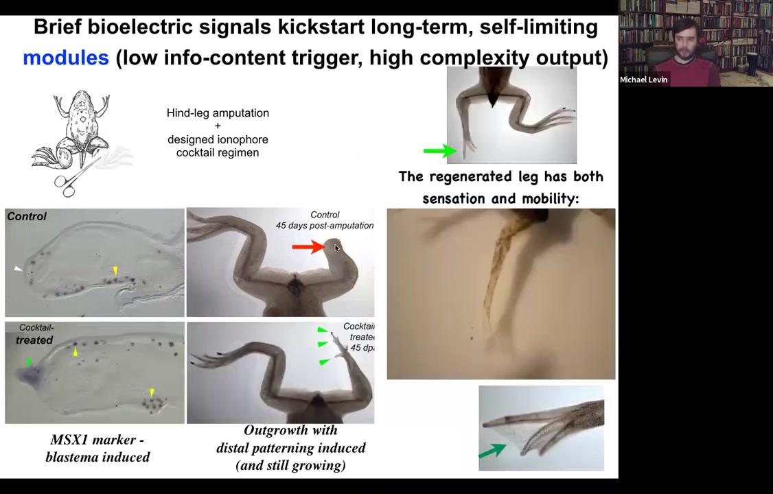 Another nice thing about this approach is that once the bioelectric circuit has made its decision, the downstream steps — second messengers, gene expression, everything else — can run as long as you want. For example, in the case of the frog, a one-day, 24-hour application of a particular cocktail gives 13 months of leg growth. You don't have to micromanage that whole process. It's just figuring out what electrical state is going to shift the tissue towards a particular goal state that all of the cells are going to work towards.