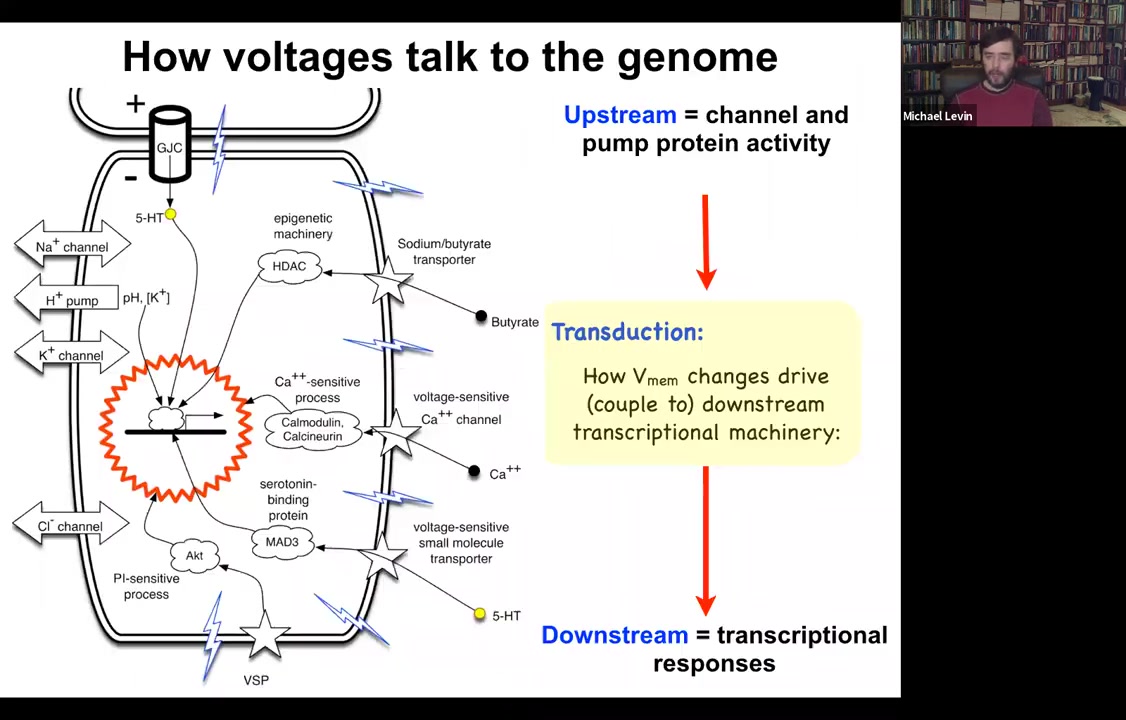 I should point out that it is already known how voltage change impacts the transcriptional machinery. People often say that it would be great if we understood how voltage controls gene expression. We do. We already know about six ways that voltage change transduces down into second messenger pathways and controls gene expression. These include typical mechanisms like calcium, which neuroscience is very familiar with, other things like voltage-sensitive phosphatases, and neurotransmitter transporters. We already know how this works at a single cell level. This transduction machinery has been dissected.