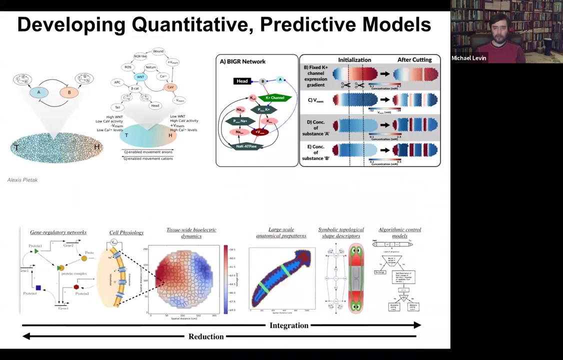 What we're doing is literally integrating every part of this so that you can build it up and then exert all your manipulations at this level. You could have your simulator and ask questions: why does the head-tail gradient rescale when you cut the planarian into four pieces? How does that work? You can't see that by drilling down into single cells. You have to come back out with that information and build these collective kinds of models.