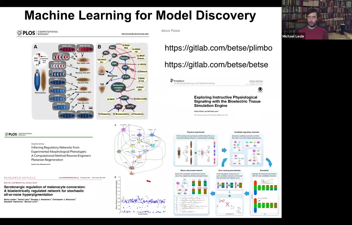 And the other nice thing about these models is that they are the perfect fodder for machine learning approaches to do two things: to infer better models from data. And we've done some of that. And then interrogate those models for interventions. And so here's some software that anyone can play with if you want to download and simulate all this. And we've shown that you can use machine learning to find models that are really good at explaining functional data sets. In other words, you did something to the system and then something else happened. What is a model that explains that? And then find these needle-in-the-haystack interventions that are ways in which you could perturb it to get it to do what you want. So that is the future of using this for regenerative medicine.