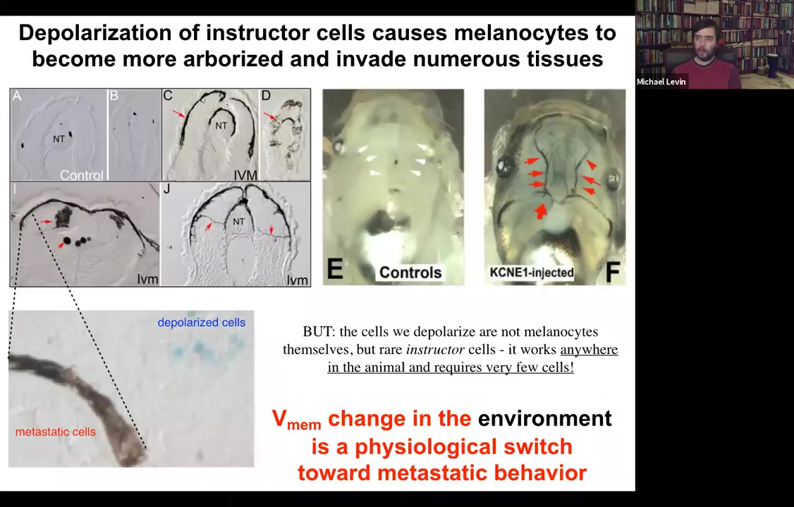 Functionally, what's really important is that you can induce a conversion of normal melanocytes. So here they are. These little black dots are pigment cells; they're melanocytes. If you depolarize a very specific cell population in the animal, not the melanocytes themselves, but a different cell population, we call them instructor cells. Those cells tell the melanocytes what to do, in particular to stay nice, cooperative melanocytes under control. If you block their ability to signal, what happens is metastatic melanoma.