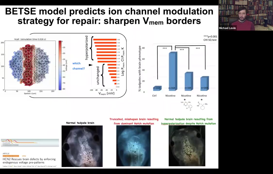 You can build a computational model. This is the work of Alexis Pytak, who's a staff scientist in my group, and a few collaborators. You can build a computational model that asks a simple question: what determines the shape and size of the brain? There's a particular bioelectrical pattern that's required for the brain. On these backgrounds of teratogens or even Notch mutation, you can ask the model a question. You can say, if this pattern is disturbed, such as it is here, what channels would I have to open or close to get back to the correct pattern? The model told us there's a particular channel, HCN2, which can help us sharpen these boundaries. Even though there are massive defects in the Notch signaling and with these various other pathways, you can still reinforce these boundaries by opening HCN2. Sure enough, if you do it with drugs or just misexpress HCN2, you can get back to a normal brain shape, a normal brain gene expression, and in fact, normal IQ. These animals get their behaviors back and their learning rates back.