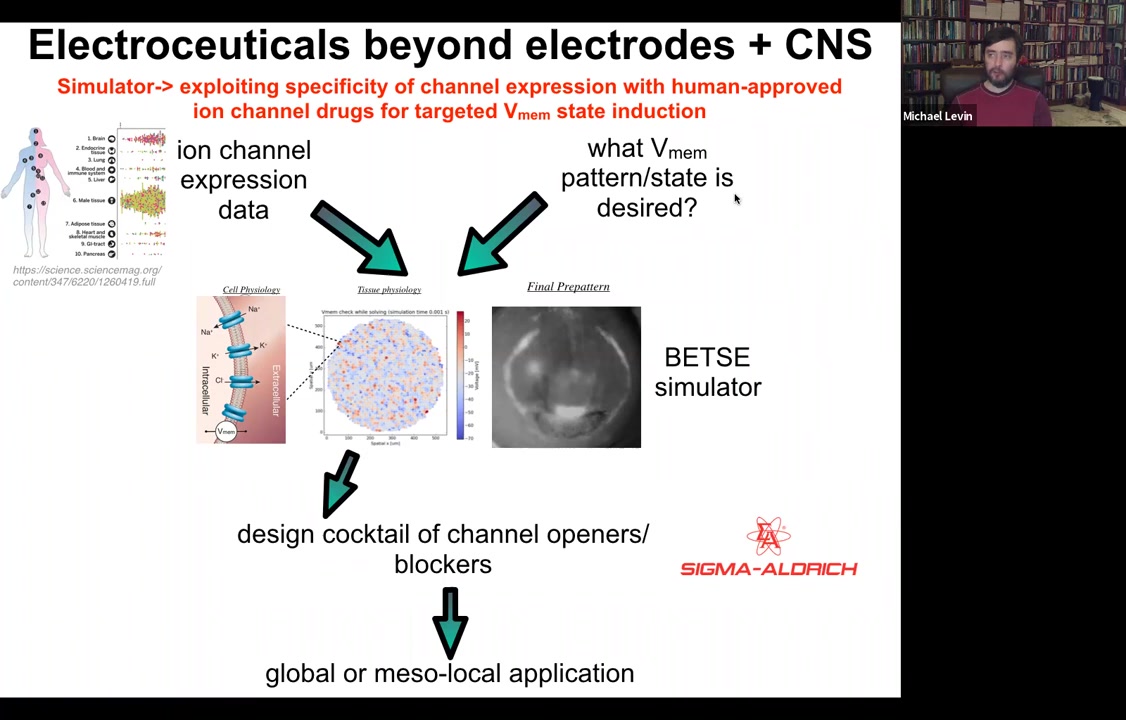 This needs a lot more work: if you knew what the voltage pattern was supposed to be in various healthy tissues under various conditions. Physiomic profiling is needed. Then we have this computational simulation engine, which is able to say, if you want to go from the incorrect pattern to the correct pattern, which of these channels you would have to open and close. That tells you immediately what cocktail of ion channel drugs you would need to use.