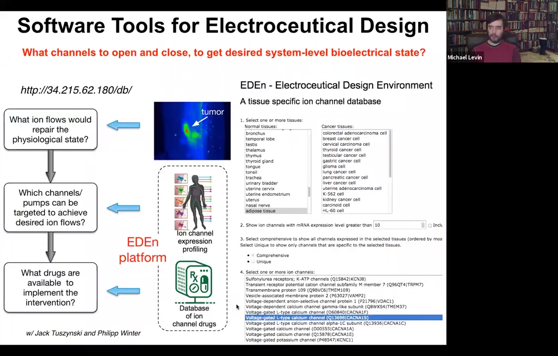 And so we've developed this pipeline. You can play with it here and choose your tissue and so on. The idea is that something like 20% of all drugs are ion channel drugs. These form an incredibly convenient toolkit of what we call electroceuticals because if you have the right computational model, you can repurpose these; the human safety data is already available. People already take them for all kinds of uses, and they have massive applicability in tweaking bioelectrical signals.