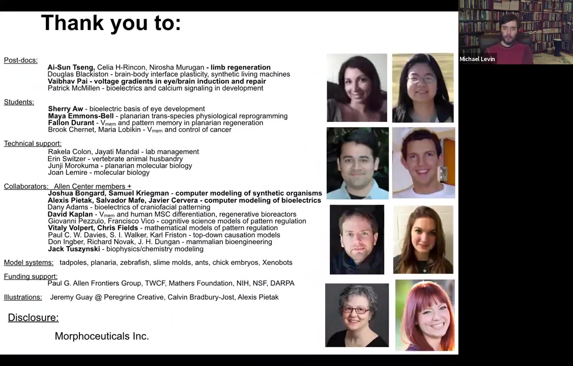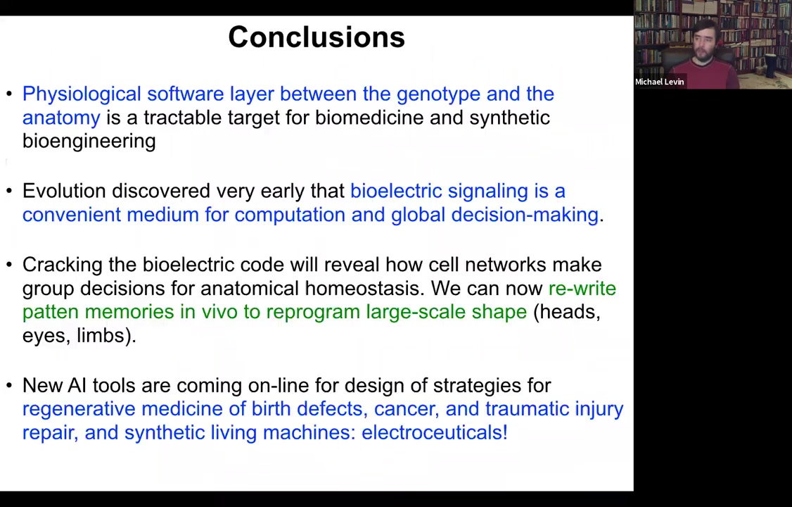 I'm going to close and summarize as follows. There's this important layer of physiological decision-making that sits between the genotype and the anatomy. It's becoming a tractable target for biomedicine and synthetic bioengineering because we can now see how the electrical dynamics operating in that tissue encode particular anatomical layouts towards which the cells continue to build.