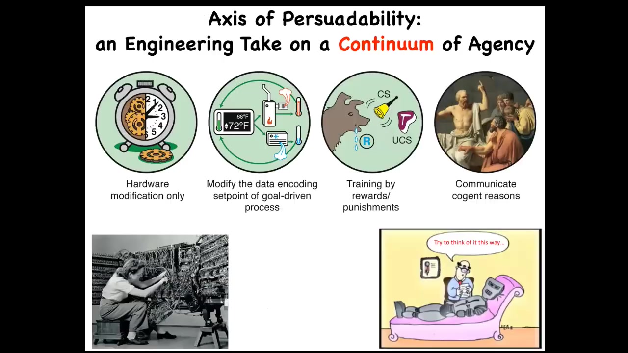 If we think about something I call the axis of persuadability, this is a continuum all the way from very simple machines all the way through to human and up. What we find is that different kinds of systems on this continuum are amenable to different kinds of interactions. Here, it's just rewiring. There's nothing else. You're not going to convince or reward a clockwork or anything like that.