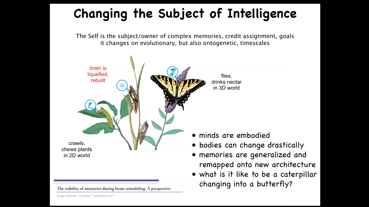 If you test butterflies and moths, they still have the memories that you trained the original caterpillar on. This work has been done and it's reviewed here. They keep the memories. Not only does memory persist through this remarkable reorganization of the substrate; when I talk about this to computer science audiences, it is a huge challenge. We don't have any substrate for computation that could do this.