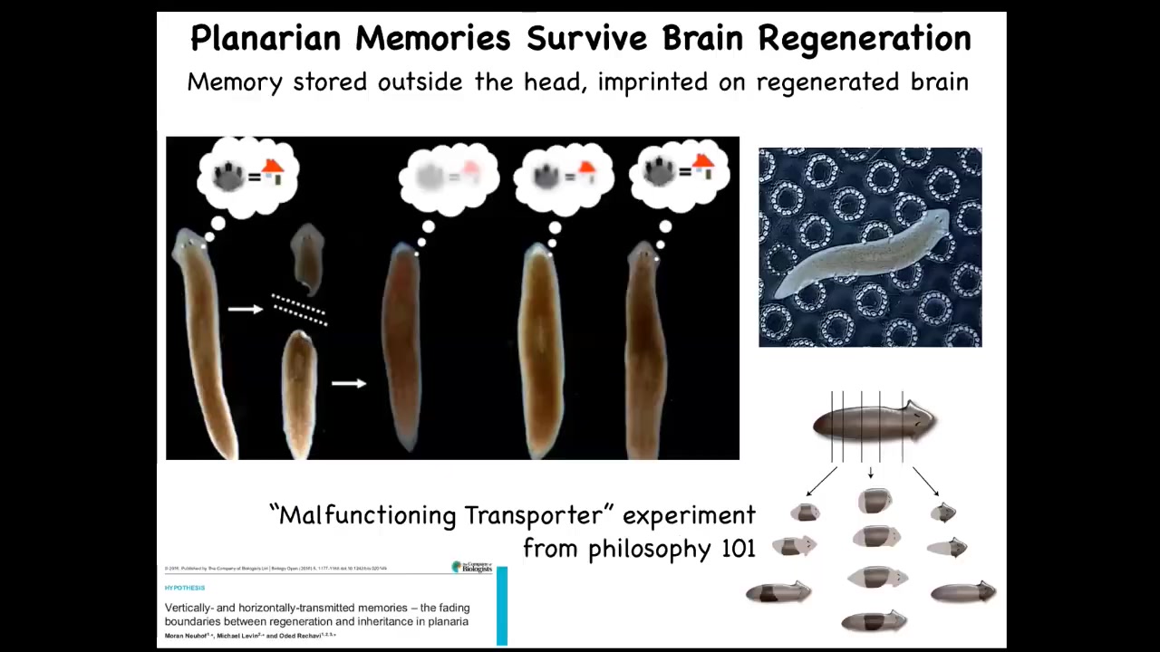 It gets even more impressive in animals like this. These are planaria. These are flatworms that regenerate every part of their body, including their brain. What McConnell discovered in the 60s, and then we later showed using modern techniques about 10 years ago, is that if you train them to find food on this particular little substrate, this bumpy substrate, it's place conditioning, you can remove their heads. The tail end here sits and does nothing. It has no behavior until the brain is formed. They form a centralized brain and their head and everything is reformed. At that point, you can show that they've retained the original information. So here you have information, presumably encoded somewhere outside of their brain, imprinted onto the new brain as it develops, so that it can run behavior. All of that is discussed here.