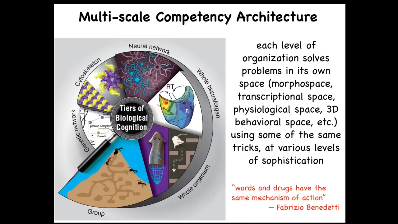 We think that it is intimately tied to our fundamental multi-scale competency architecture. This is the idea that our body, from the lowest molecular level up through the level of multiple individuals and various swarms, every layer is competent in its own space. In fact, some may be in multiple spaces. They all solve problems. They're not merely structural nested dolls; they solve interesting problems.