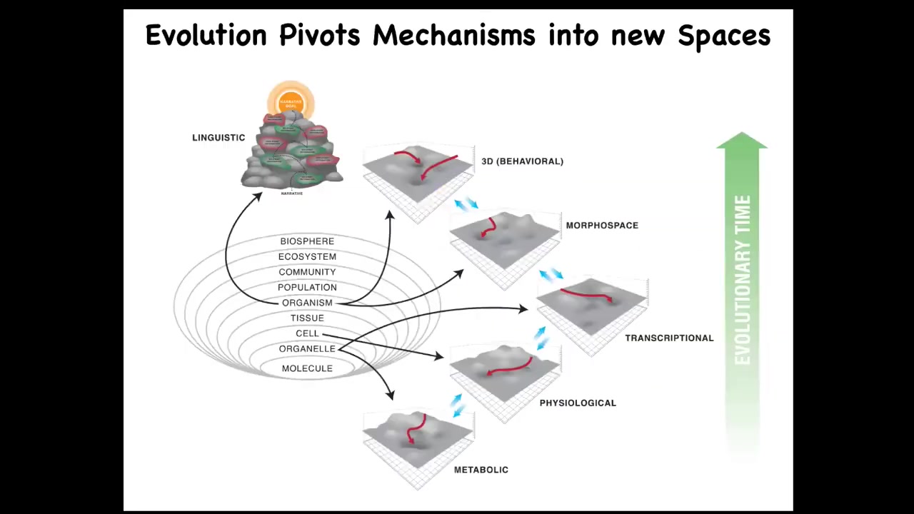 One hypothesis that we've been working on is this idea that what evolution basically does is pivot some of the same tricks, and there's this fundamental trick about navigating various spaces, but it pivots this through different spaces, maybe making some specializations, but basically all the way from metabolic spaces at the beginning of life all the way through to eventually linguistic spaces and the need to keep a straight narrative in a complex linguistic space. This traditional behavior is what most people in the field study. What we just talked about is this idea that we really need to broaden some of our ideas around what implementations might support different kinds of intelligence and this plasticity that is underlied by the fact that all of the components are actually solving problems as well.