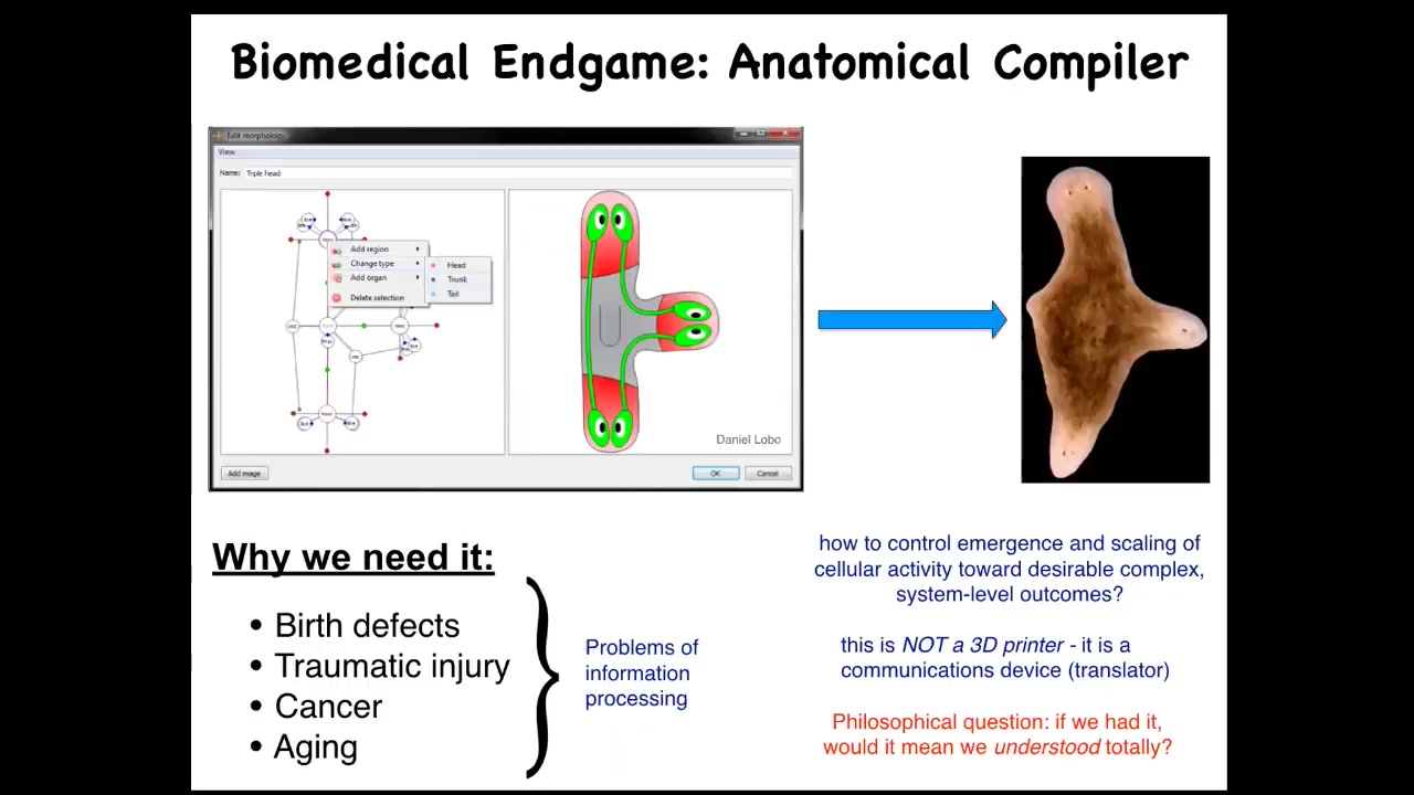 We're very interested in this thing, which I call the anatomical compiler. I thought of this when I was thinking about the end game of our whole field, what are we going for such that when it's done, we can all go home. The idea is that at some point in the future, you'll be able to sit down in front of a computer system and draw the plant or animal that you want, or the organ or the weird biological robot. It doesn't matter.