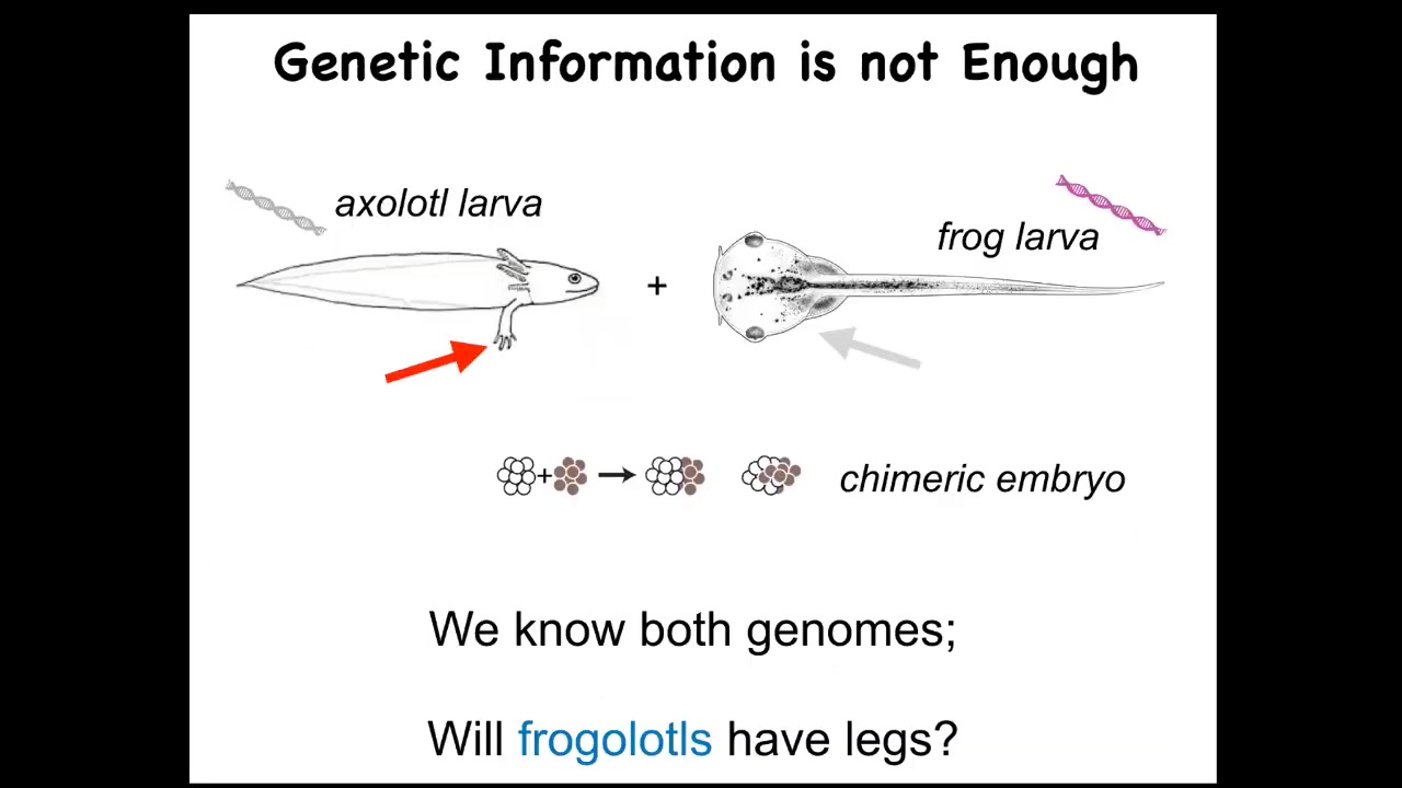 I want to point out a very simple example. This is a baby axolotl. Axolotls have little four legs at this stage. Here's a frog larva. They do not have legs at this stage. We make something in my lab called a frogolotl. This is just a chimera of an axolotl and a Xenopus embryo. Both of these are sequenced. You've got the axolotl genome, you've got the frog genome. Now I ask a simple question: are frogolotls going to have legs or not? The fact is we have no idea. We can look empirically, but nobody can make a prediction. There are no models, despite the availability of genetic information, that will make a prediction on an experiment like that. In fact, the genomic data can't even be used to guess what the actual shape of the organism is going to be unless you cheat by comparing that genome to something else that you already know.
