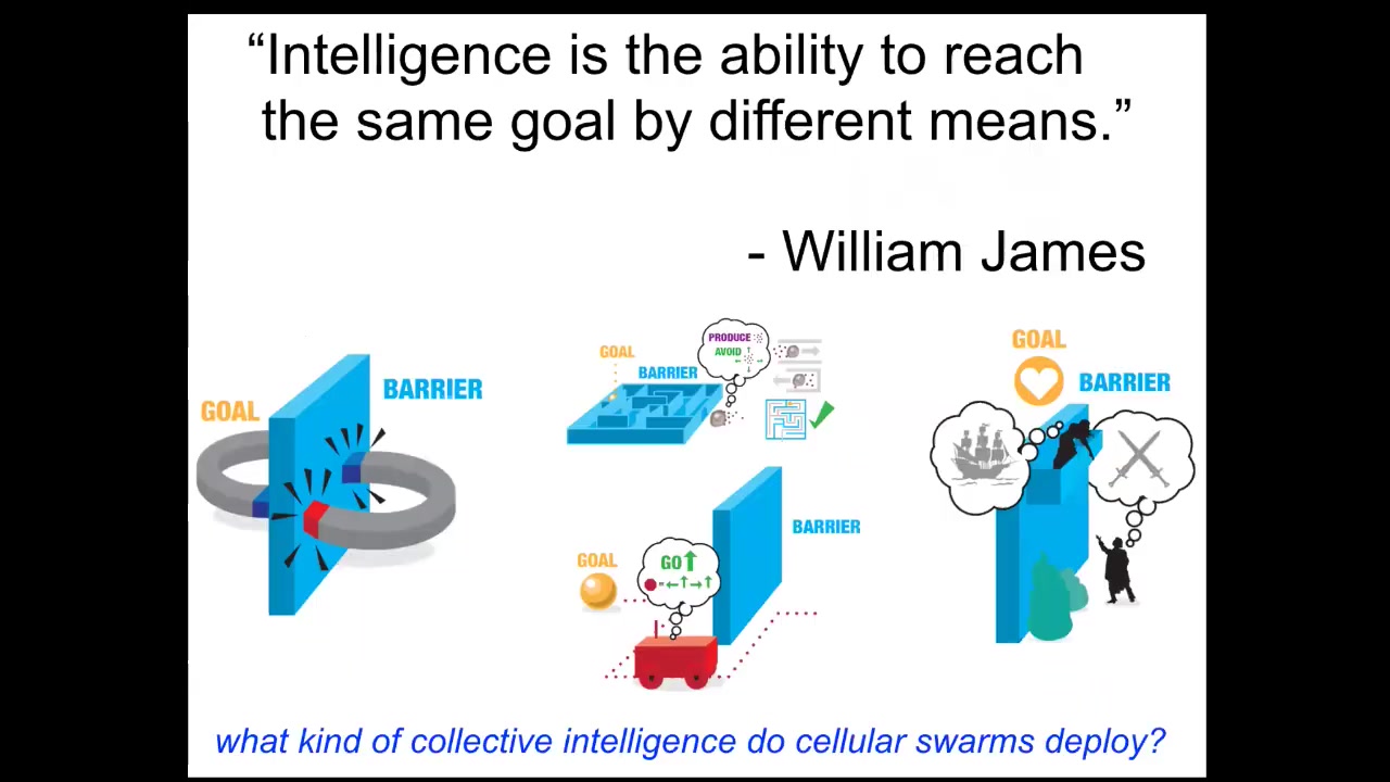 And what do I mean by intelligence? I like William James's definition. William James said that intelligence is the ability to reach the same goal by different means. It's a cybernetic definition. It doesn't talk about brains or whether you were engineered or evolved or anything like that. It talks about the difference between two magnets trying to get together, which if faced with a barrier, will simply stand there pressed up against the barrier. They're unable to walk around, temporarily get further from their goal in order to finally reach it. They have no delayed gratification ability, a very simple system. Romeo and Juliet, on the other hand, have all kinds of complex abilities, including planning, to try to get their goals met. In between, you have all sorts of things, cells and tissues and self-driving vehicles and animals of different types. This ability to reach the same goal, despite novelty, is a kind of measure of this intelligence. It's important because these competencies, these capabilities, can be taken advantage of in therapeutic contexts if we understood how to deal with them. What kind of collective intelligences do cellular swarms have? I'm going to show you a few examples.