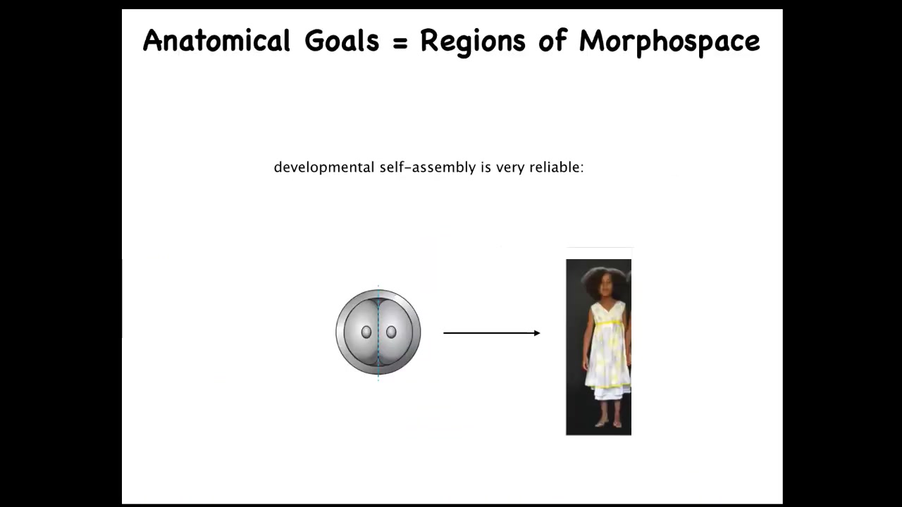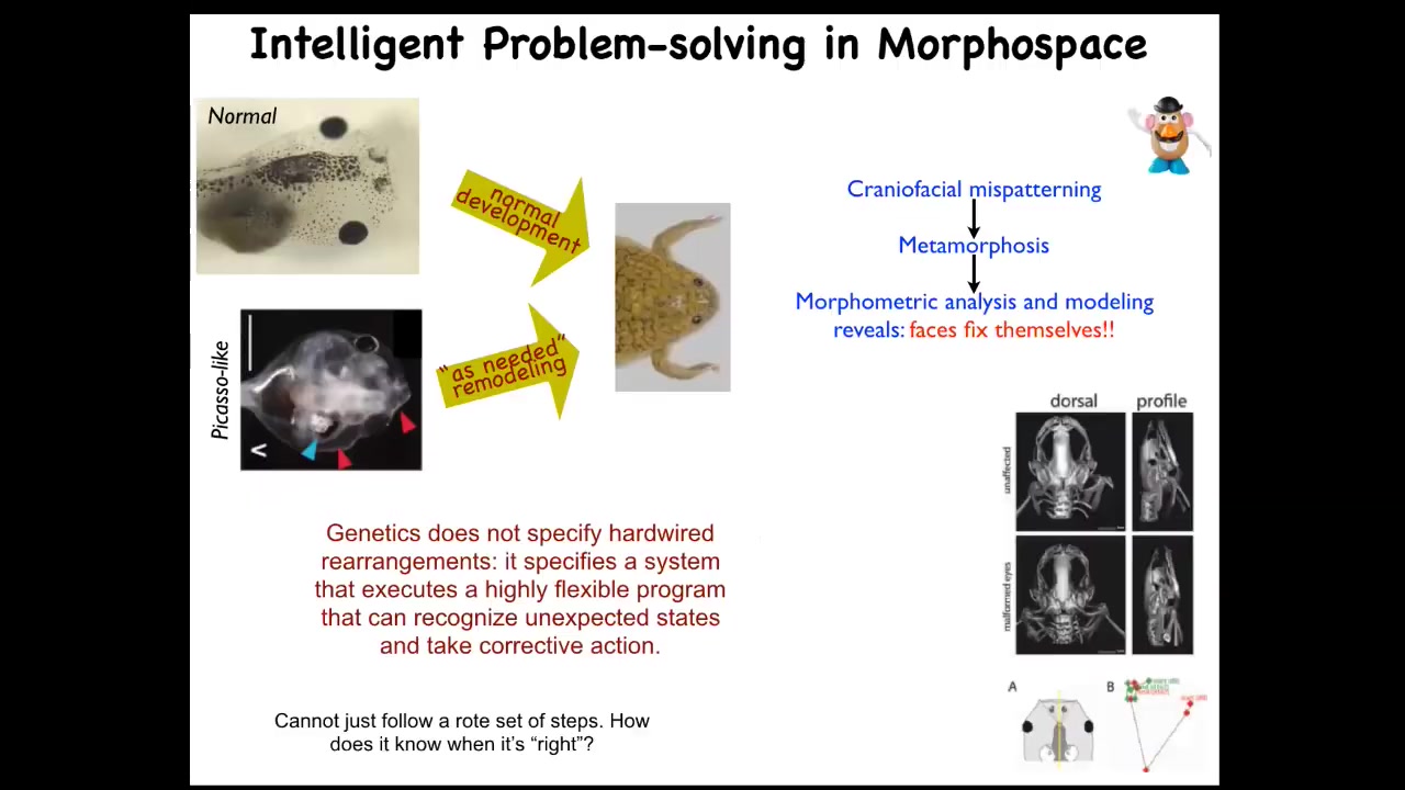 What we found out is that these animals actually end up being pretty normal frogs, because all of these organs do not just go in the same path that they do in normal animals. They will go in novel abnormal paths. In fact, sometimes they go too far and they have to double back until they get to the correct frog face and then they stop. So what the genetics actually gives you is an error minimization scheme, a system that can recognize that it's in the wrong state and take corrective action to get where it needs to go to complete that journey in morphospace despite being started in a very abnormal configuration.