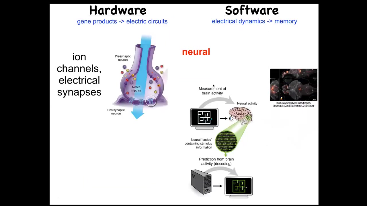 Now, in thinking about where to find the set point, we said, what's the one example, the one non-controversial example of a biological system that really encodes goals and the pursuit of goals? That occurs in neuroscience. We know what the hardware is. The hardware are these networks of cells that achieve a certain voltage potential by means of ions moving through the ion channels. They may or may not communicate that voltage to their neighbors through electrical synapses known as gap junctions. And so that's the hardware. The software here that's mediated by this can be read out. This group made this amazing video of a living zebrafish brain. You can see all the electrical signaling. It's the commitment of a lot of neuroscience that this is really the encoding of the cognitive content of this individual. There's this process of neural decoding that if we were to record all the electrical activity, and if we knew how to decode it, you would be able to read the animal's memories, preferences, goals, potential behaviors. That's the process of neural decoding. This physiology is where we think all of that is sitting. The amazing thing is that actually every cell in your body does this. Every cell in your body has ion channels. Most cells have gap junctions to their neighbors. From the earliest time of development, your tissues are an electrical network that is processing information. Now, we can then try the same kind of decoding research program. Could we decode the bioelectrical signals in non-neural tissues and ask what are they thinking about? What problems are they solving? In particular, much like here, we're tracking the voltage with a voltage reporter. This is an early frog embryo in time-lapse, reporting the voltage so we can see all the electrical conversations that these cells are having with each other as they sort out who's going to be head, tail, and so on.