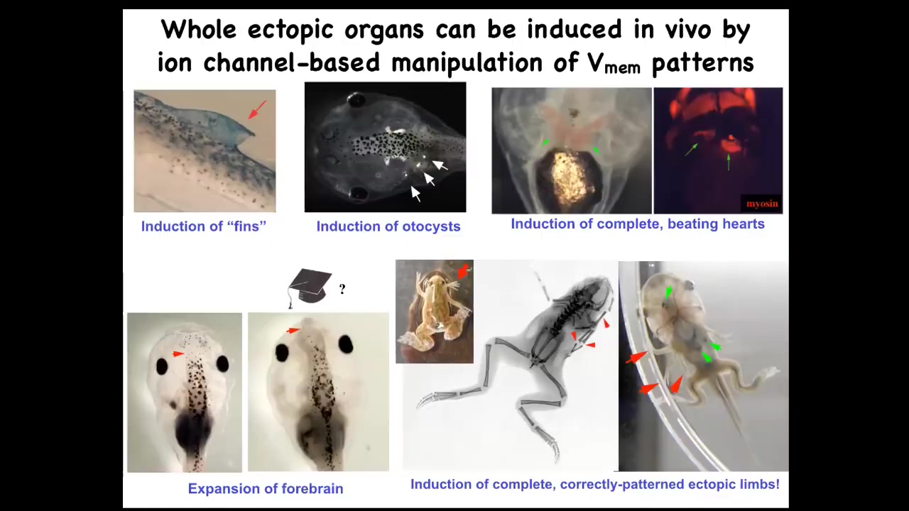 Remember that little eye spot that I showed you in the bioelectric face? You might ask, what happens if you introduce that same kind of spot somewhere else? You take a memory of eye formation and you falsely reproduce it in other regions of the body that are actually supposed to be doing something else. If we inject specific ion channels that can induce that same type of eye spot that I showed you a minute ago, and introduce it into cells that are precursors of things like the gut, those cells will happily build an eye.