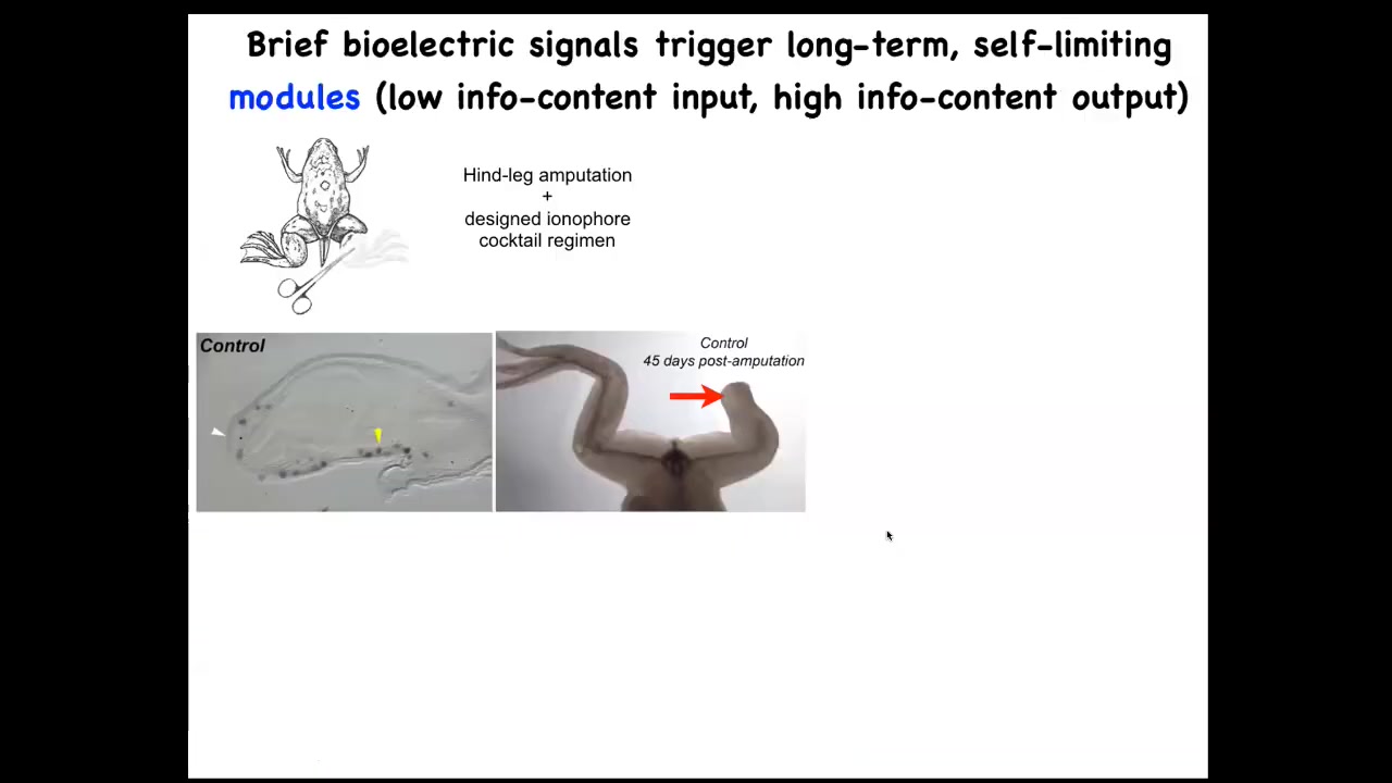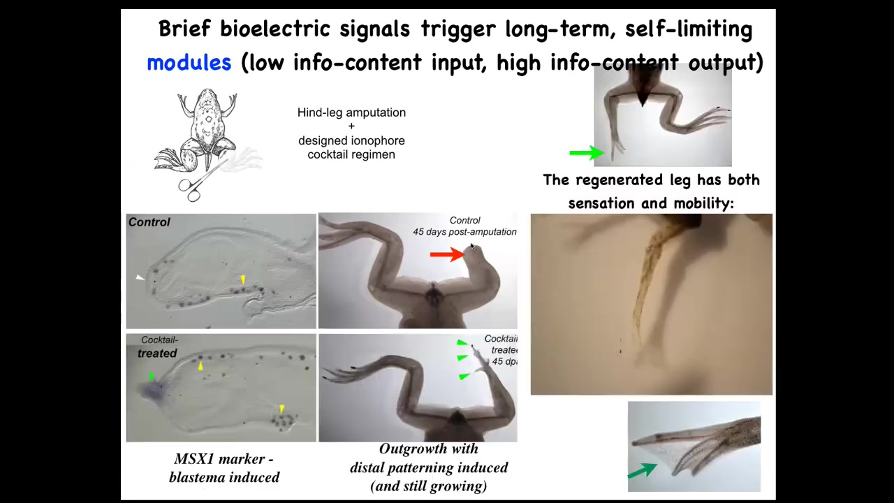 We came up with a cocktail that within 24 to 48 hours triggers pro-regenerative genes like this MSX1 in this blastema. By 45 days, they've got toes, they've got a toenail, and eventually a pretty respectable frog leg that's both touch sensitive and motile. The thing about this is that this is not micromanagement. We're not 3D printing anything. We're not controlling stem cells. We're not interacting with this thing at all; 24 hours of stimulation, and then for a year and a half this leg will grow. So it's the decision-making of the collective very early on. It's not trying to micromanage it.