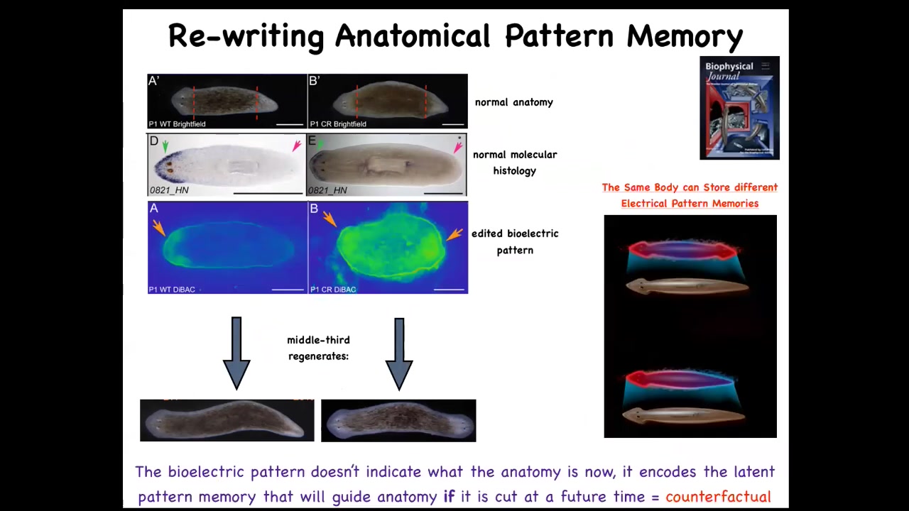 Something important to stress here is that this bioelectrical pattern is not a map of this two-headed animal. This is a readout of this one-headed animal, which is anatomically and transcriptionally normal, and it will be that way. It will stay normally one-headed until you injure them. This is a readout of a counterfactual memory. It's what I will do if I get injured. It's what a correct planarian looks like, aka the set point of that anatomical homeostatic cycle.