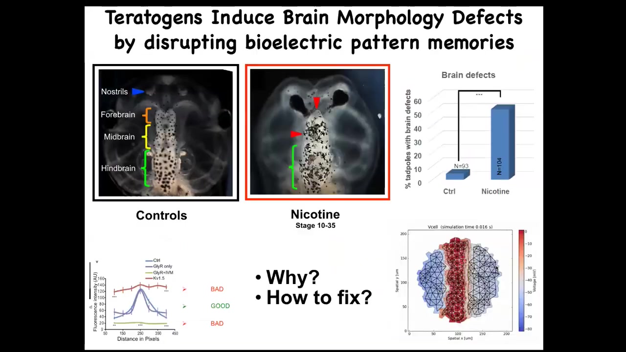 I'm going to show you one example where we've been able to do that, which is this in the frog brain. Here's the normal frog brain, forebrain, midbrain, hindbrain. There are a variety of teratogens, both chemical and genetic, that screw up the brain. We decided to check whether we could use a computational approach to try to repair this very complex structure. We made a computational model of the bioelectrics around the pre-pattern that tells this brain the shape and the size that it should be, having characterized this pre-pattern years before that.