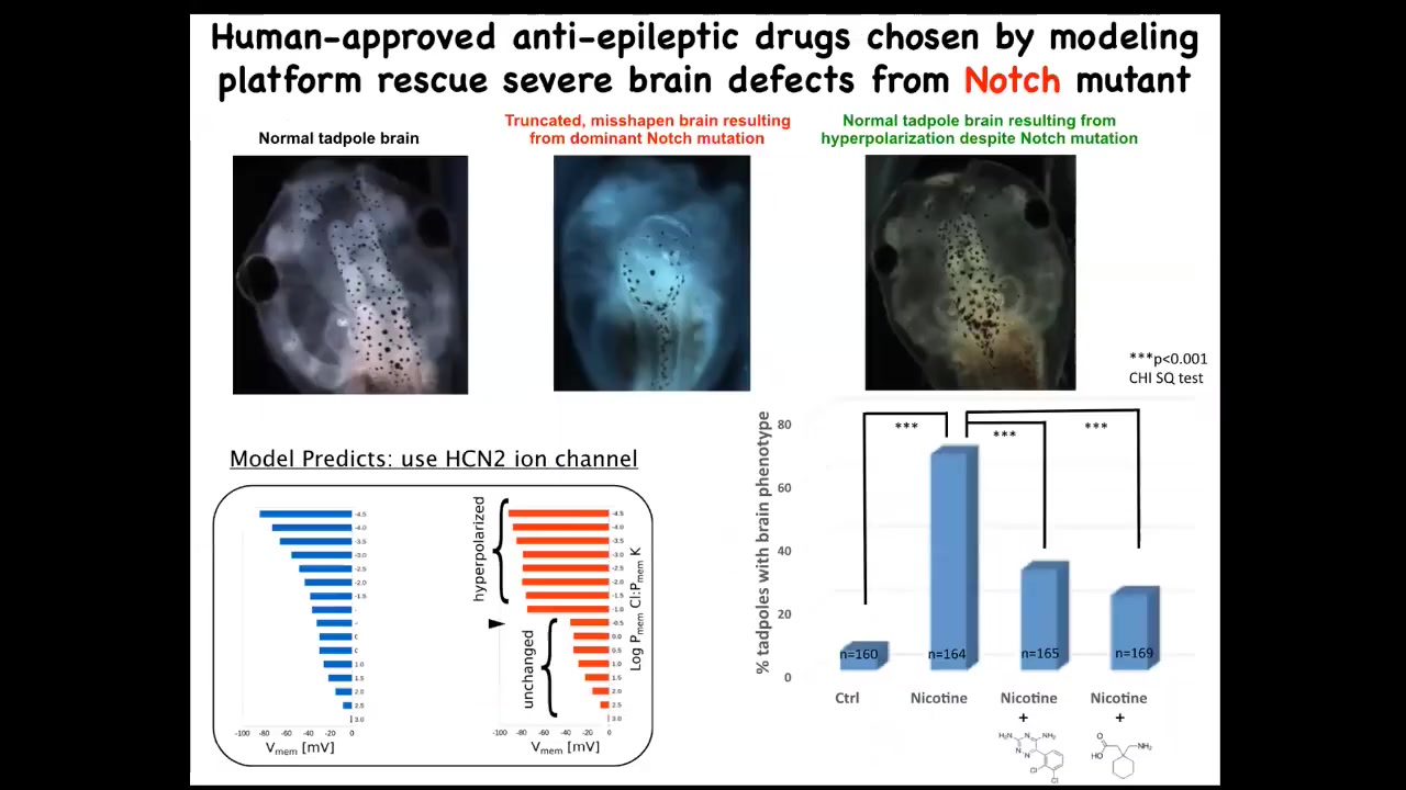 We created a computational model of this. We asked the model, "What channel could we open or close to get back to the correct bioelectrical state?" It focused in on this. It's a very interesting channel with some specific properties, called HCN2. We found that when we upregulated HCN2, either by injecting RNA encoding it or with HCN2 openers, you basically get back to a normal brain, anatomically normal in terms of gene expression, and they get their IQs back. They have indistinguishable learning rates from control animals. All of this while still having that Notch mutation.