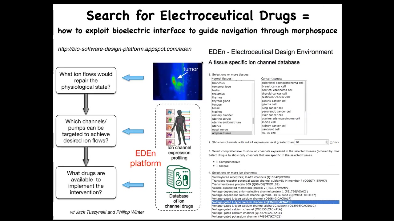 You can say I have an abnormal bioelectric pattern in some region, and it will computationally model it, then give you a list of channels and pumps that are expressed in that region, which we know from scraping transcriptomics profiles. It will give you targets to try to get the incorrect pattern into the correct pattern. Then you can pick drugs, because something like 20% of all drugs are ion channel drugs. This is a huge toolkit of potential electroceuticals if we understood the modeling.