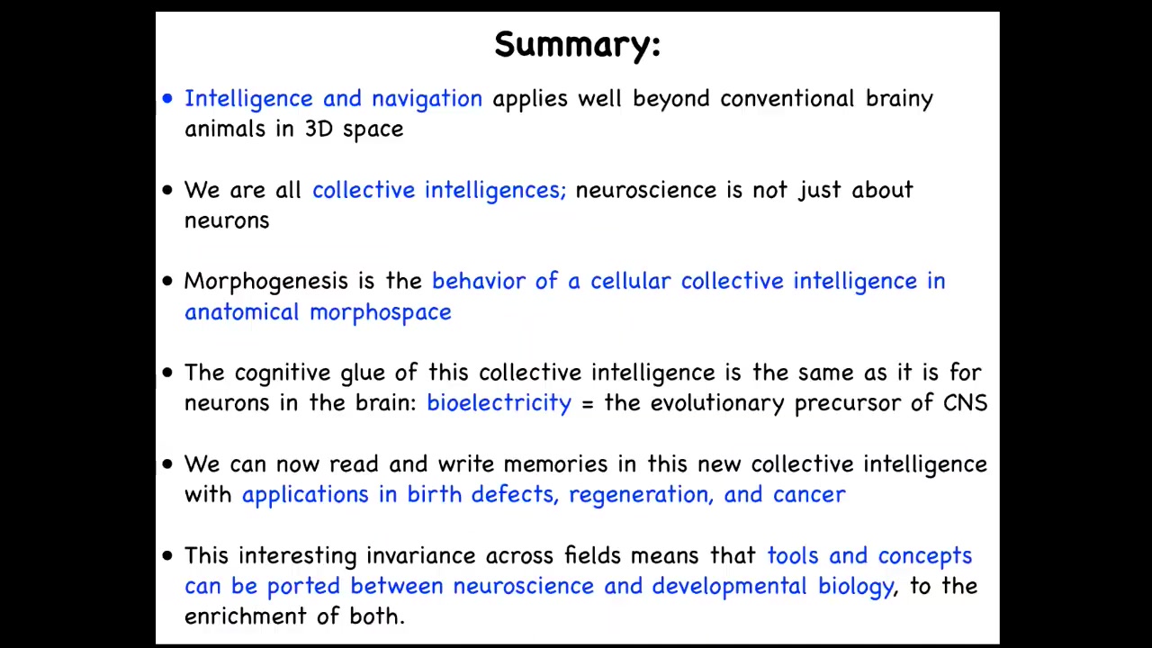So what I've told you today is that intelligence and navigation of problem spaces is, I think, a generic concept that's applicable far outside of standard behavioral science. We're all collective intelligences.