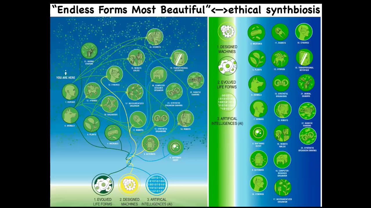 And the final thing is that because of this amazing interoperability of life and the fact that cells and tissues are a kind of material that are happy to work with, all sorts of novel configurations and new materials and so on. All of existing biology, everything that Darwin meant when he said "endless forms most beautiful," is like this tiny corner of option space. In the future, meaning the next couple of decades, we're going to be surrounded by all of these things that already exist, especially in neuroscience. Cyborgs, hybrots, different kinds of chimeras and combinations, all kinds of bodies and minds that we've never seen before that have never been on the tree of life with us. We are going to be looking for insights from diverse intelligence research to expand the way that neuroscience and behavioral science thinks about agency, cognition, memory, and how we are going to ethically relate to these creatures that actually don't look anything like us. You can't use the familiar kinds of things we use when talking about brain organoids in a dish. What does the brain look like? Is it like a human? It doesn't need to be like a human. There are going to be all sorts of wild combinations that we need to think about.