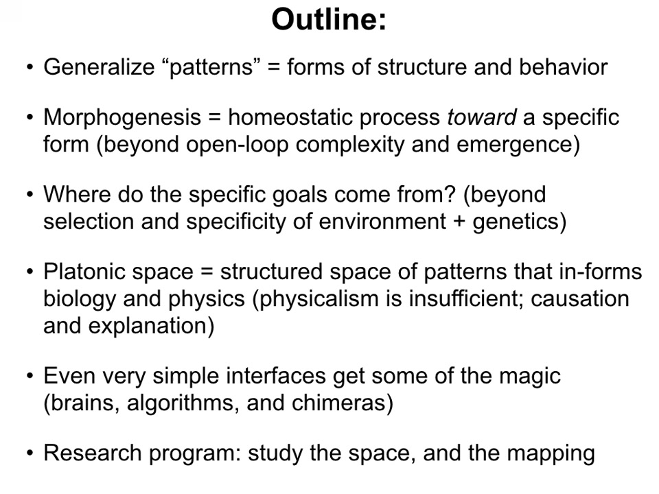 The basic structure of what I'm going to say today has these components. First, I want to talk about the notion of patterns that are generalized types of forms of structure and behavior. They're specific forms in various spaces. Then I'm going to talk about morphogenesis as an example, a model system that we use, which we are going to describe as a homeostatic process that aims toward a specific form. It's a navigation of a space and error reduction to try to get to a specific form. This is in contrast to the mainstream paradigm of complex morphologies arising by emergence from open loop complexity, things like cellular automata and so on.
