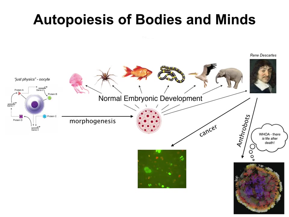 The first thing to note is that we all arise via this specific process, this journey from being something that people think amenable to the sciences of chemistry and physics. This is a quiescent oocyte, a little BLOB of chemicals. Then through this amazing self-assembly process known as embryonic development, we self-assemble the form of our body, the anatomy, and even the form of our behavior. Perhaps we end up something as complex as this, which then will make statements about not being a machine. This is a slow, gradual process by which our bodies and our minds come to be. This is not the end. There are some other interesting things that I've covered in other talks where the morphology of the body can actually undergo some really profound transformations. Now we can talk about what's actually going on here when we make this transition.
