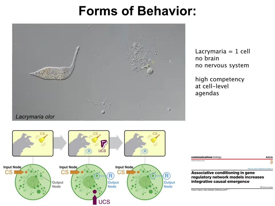 Now, forms of behavior. We can start at the single cell level. This is a lacrimaria. It's a single-cell organism. You can see it has some remarkable behaviors that are the envy of soft matter roboticists and things like that. It has all these local competencies in its own tiny little cognitive light cone, despite the fact that it doesn't have a brain or a nervous system.