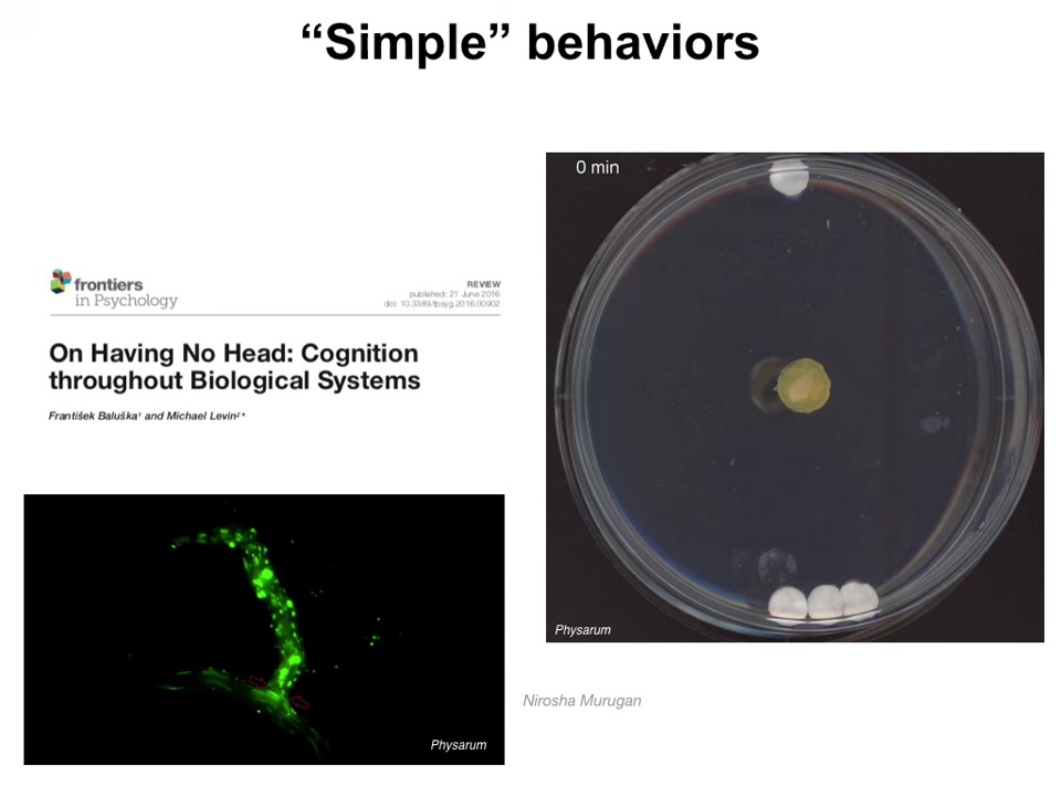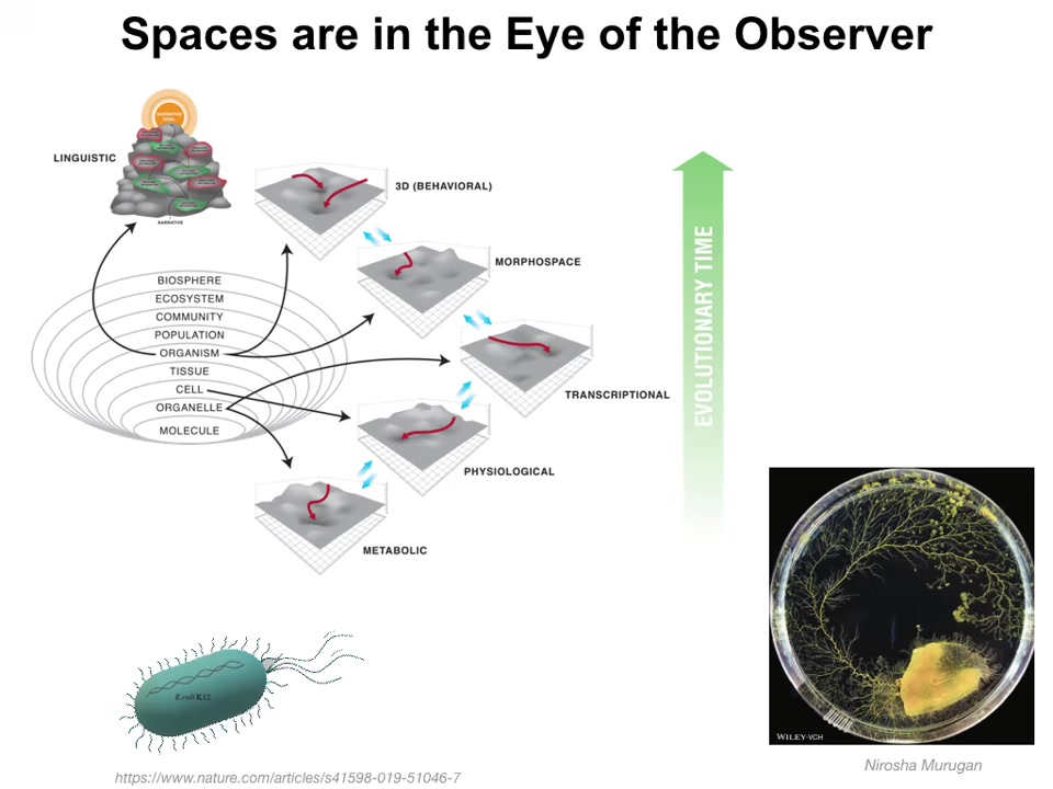 Physarum, this slime mold, its behavior is its morphogenetic change. That is how it does behaviors—by changing its shape. This neat division into various problem spaces is up to the observer who's trying to understand what's going on.