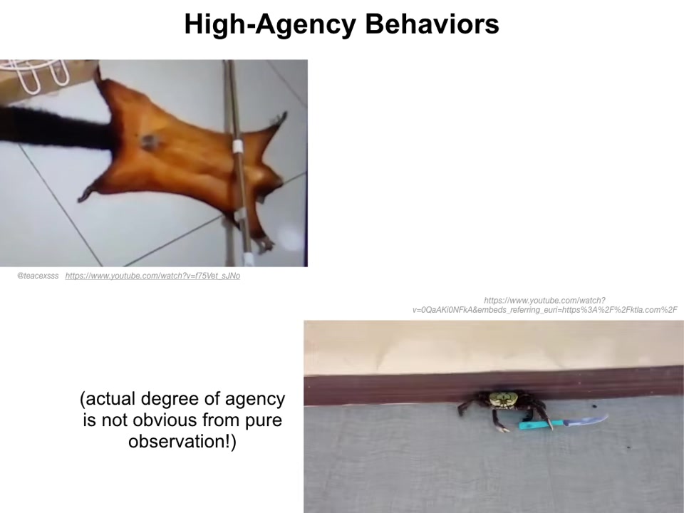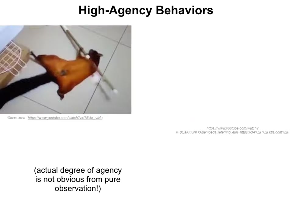 We find it pretty easy to recognize high agency behaviors. Here's the squirrel. It's going to set up a little accident scene like this. Very intentional. In a moment, it's going to look up to make sure that its owners are catching what's happening here. It wants some attention. We can all recognize this because it's very similar to ours. It happens on the same time scale, same roughly spatial scale. These creatures live in a similar world that we do. They want some of the same things that we want.