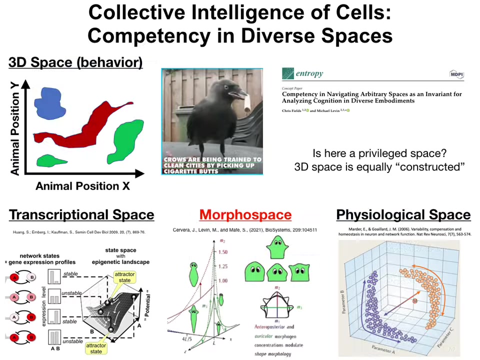 Chris Fields and I wrote this paper to try to show what's common to all these spaces is the ability of biology to navigate and to do the perception-action loop that we associate with intelligence, and that loop, that control of behavior, can be done in many other spaces. In fact, I'm not sure that three-dimensional space is privileged at all. I think to some extent we construct it cognitively just like we can construct all these other spaces.