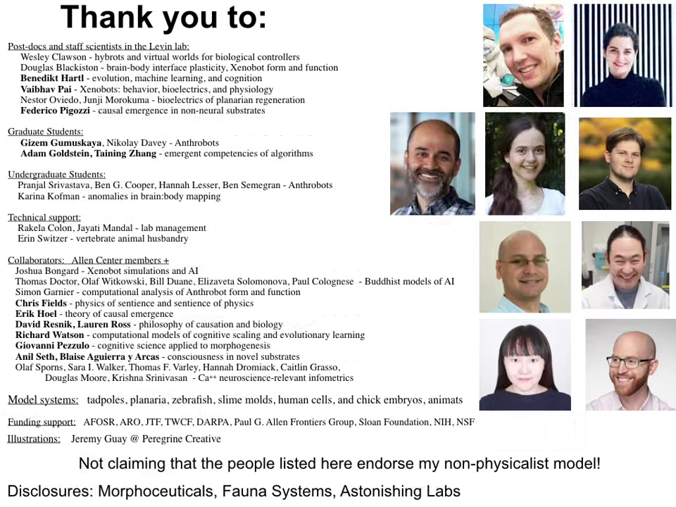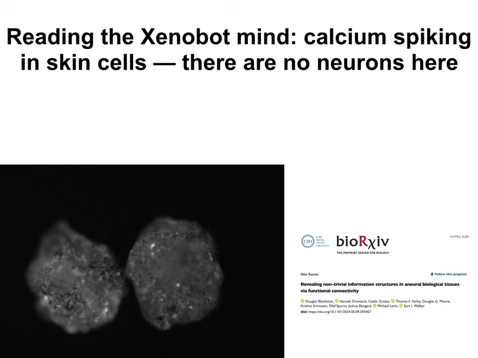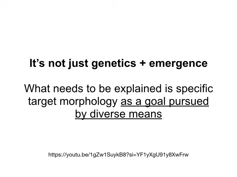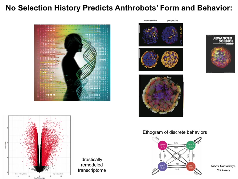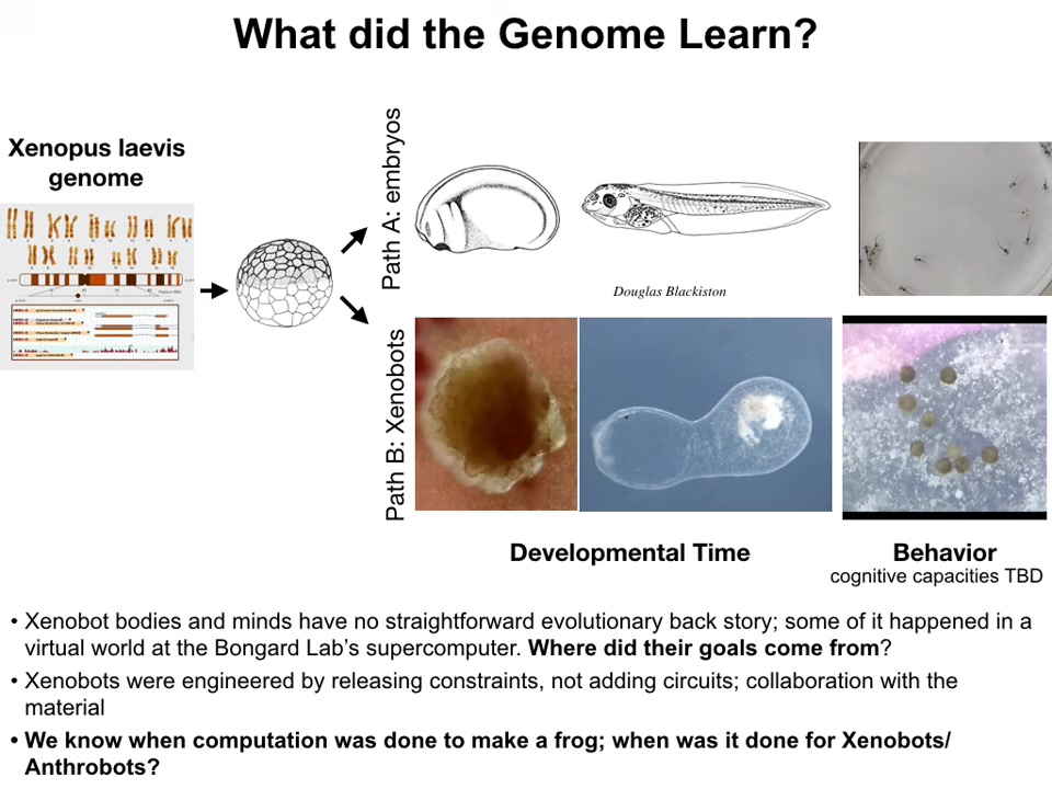 In these two cases of xenobots and anthrobots, there is no straightforward evolutionary backstory. Where did these goals come from? There's never been selection to be a good xenobot or a good anthrobot. What we see is that the hardware is picking up other kinds of patterns that we cannot say came from selection. You can try and say that these things were learned at the same time that it learned to be a frog or a human. That breaks the whole point of evolution as being able to explain the specific features of a creature with reference to the details of its past, the details of the selection forces in its environment. Nothing, looking at the human, the history of the human body, tells you about xenobots or about anthrobots, about the genes the anthrobots are going to express, about the neural healing that they do and all kinds of other things. Those things are just not derivable in any obvious way from the evolutionary selection forces.