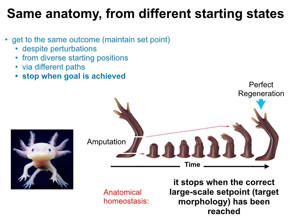 When does it stop? It stops when the correct axolotl limb has been completed. So there's the ability of the system to detect when it's been deviated from the correct target morphology, it works to get closer to that target morphology, and when the error is within acceptable levels, it stops. This kind of thing is pattern homeostasis or anatomical homeostasis. It shows you that it's not an example of cells doing what they do. If you try to deviate it from their goal, it will work hard and spend energy to get back to where it's supposed to be.