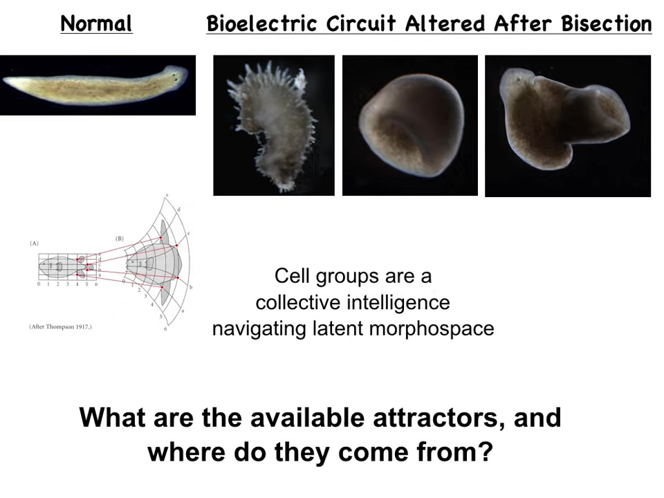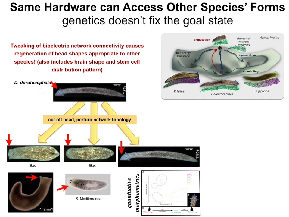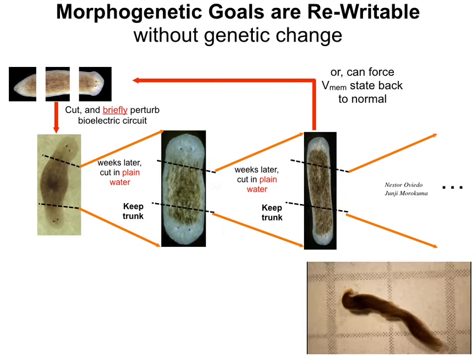 What I'm showing you here is that not only is there a kind of specific form that the processes pursue, but that form is rewritable because it is selected as an endpoint or a set point towards which these mechanisms strive. You can see here, these are two-headed flatworms hanging out in this video.