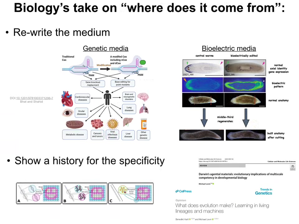 We can build new interfaces to observe new ingressing forms. The synthetic morphology work of our group and many other groups provide some amazing vehicles for exploration of that space. I think we need to start to infer a model of the mapping between the properties of the pointers and the patterns they facilitate. We need to quantify the free lunch aspects. So how much information and influence and evolvability is really injected into the physical world? To what extent, to what numerical extent do we get more than we put in when we make various interfaces? And is it just static patterns or could we actually get free compute? Is there dynamic computation that we can get in this way?