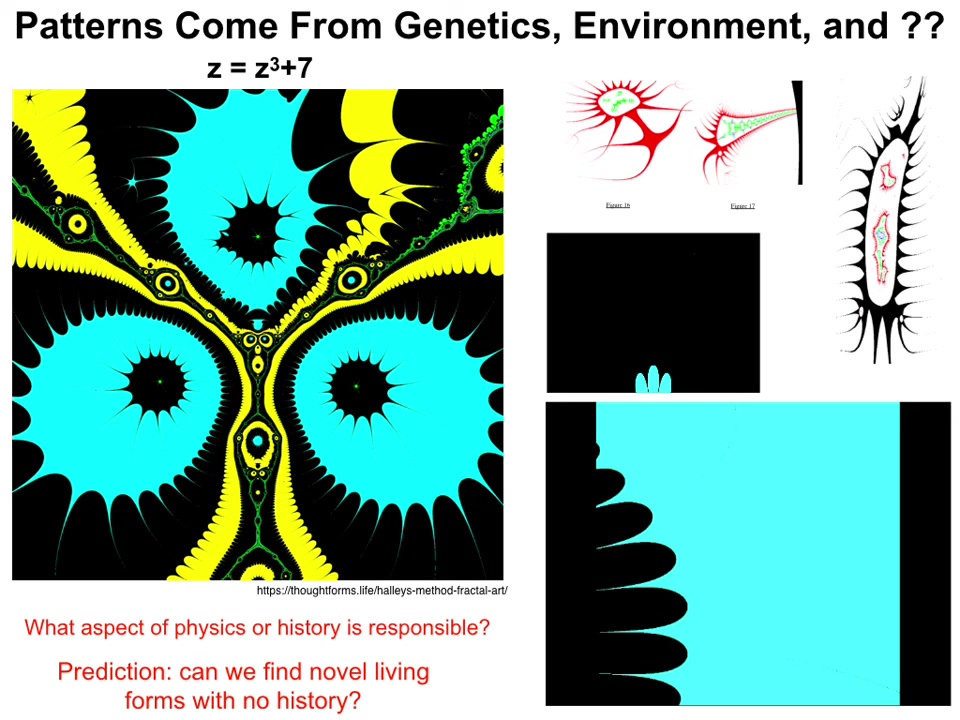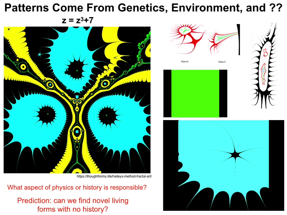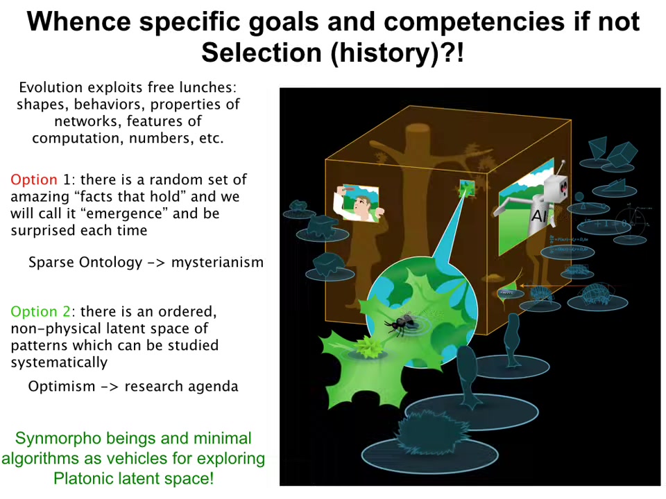 But what it does is cast synthetic morphology beings such as arthropods, xenobots, chimeras, and so on, and computers and robotics and so on, all of these things are vehicles for exploring this platonic latent space of patterns. If we assume that the forms that I've been showing you that serve as the target of behavior at different scales are not random surprises, but are part of an ordered, structured, latent space, then we can use these constructs to explore the space, to watch what kinds of patterns are manifested by these things and work out the relationship.