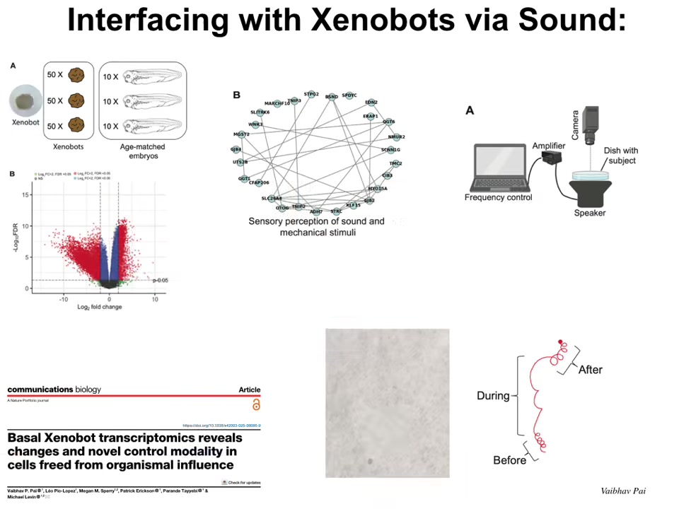 Another interesting thing is we found out that these xenobots have a really altered transcriptome. They have hundreds of genes expressed differently than the cells would have if they had been inside the embryo. Lots of interesting genes get upregulated. One, just as one example, one thing that gets upregulated is a cluster of genes related to the perception of sound and mechanical stimuli. We saw this. This is the work of Vaipav Pai in this paper, and we asked, is it possible that these things now could actually perceive vibrations or perceive sound? Because these are genes that they would not otherwise, in their normal environment in the embryo, be expressing.