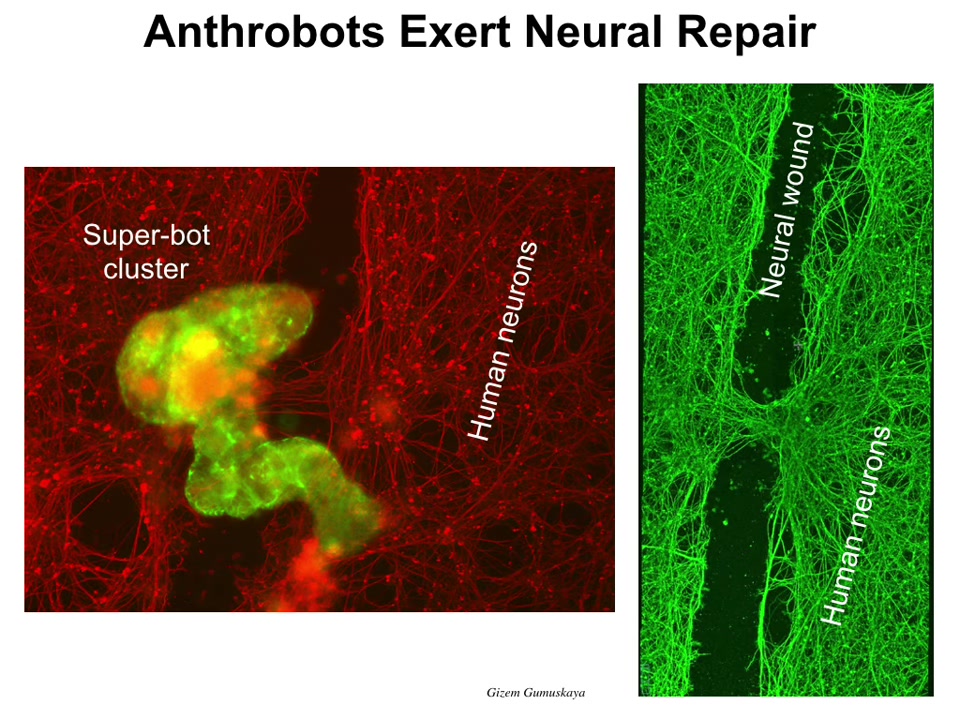 Here's something cool that the Anthrobots can do. If you lay them down on a field of neural cells and you put a big scratch through it, so here's a wound, these anthrobots will gather into something we call a superbot clusters. So there's maybe a dozen of them here. They kind of gather into this pile. And what you see here is that over the next four days, they start to knit across the gap. Here's where the anthrobots were sitting. When you lift them up, this is what you see. They're actually repairing the tissue. So they have this ability to repair other tissue damage. Now, who would have known? These cells sit in your trachea quietly for decades dealing with mucus and things like that. And it turns out that they can form a self-motile little creature with the ability to repair the neural tissues.