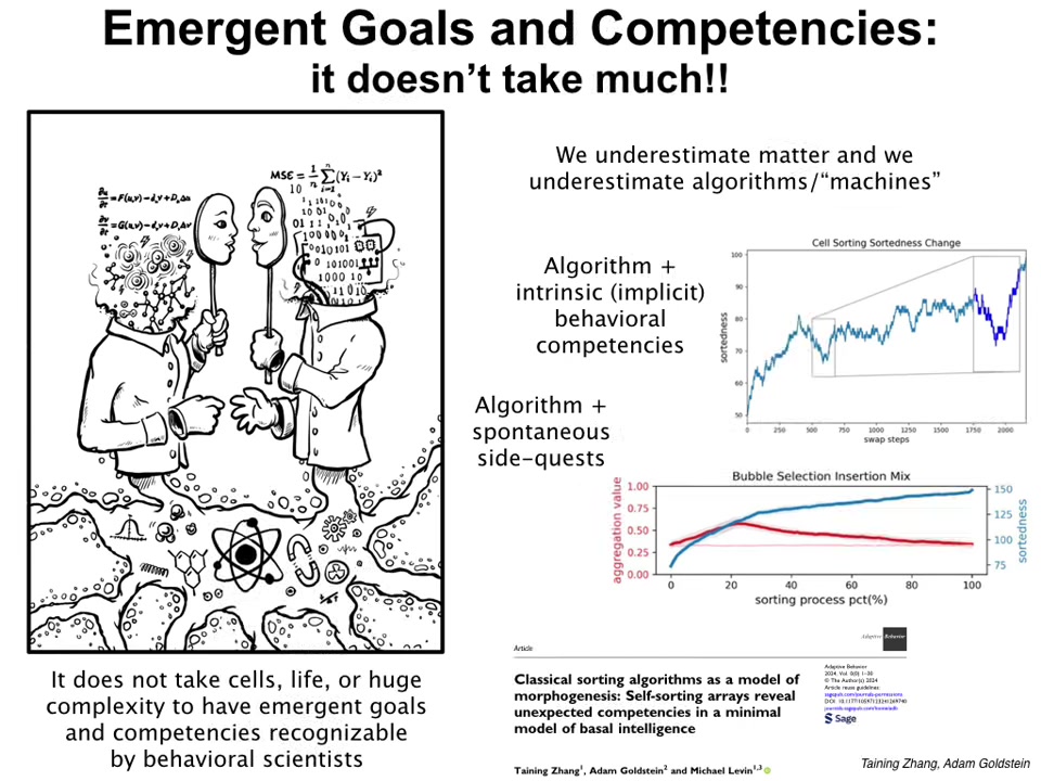 What we're seeing here is that even in extremely minimal systems like deterministic sorting algorithms, but certainly in complex biologicals, there are novel goals that do not seem to come from the typical sources taken to be the origin of these patterns, which are either the physics, the history, or in this case, the algorithm. There are things that are not explained by any of those and not predicted by them. Consistent with them, none of this is magic: physics or the algorithms do not prohibit these behaviors, but they do things that are not predictable or obvious, not explicitly stated in these sources.