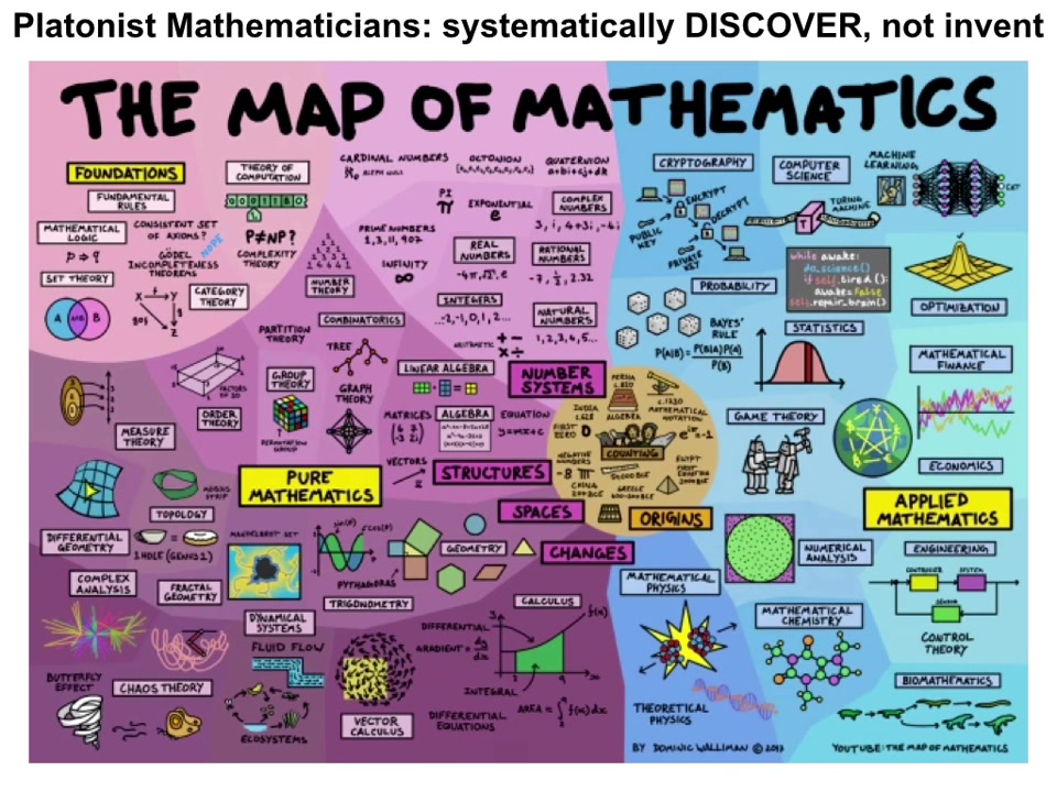 I'm not trying to stick close to any of these specific proposals, except to say that there are many, many mathematicians that believe that there is a space, that what they're doing is mapping out the space, that they are systematically discovering, not inventing, but discovering the kinds of objects that live in that space. And they can move from one to the other by learning about each one. And that's the conventional view, is that this Platonic space contains properties of mathematical objects, truths of different branches of mathematics.