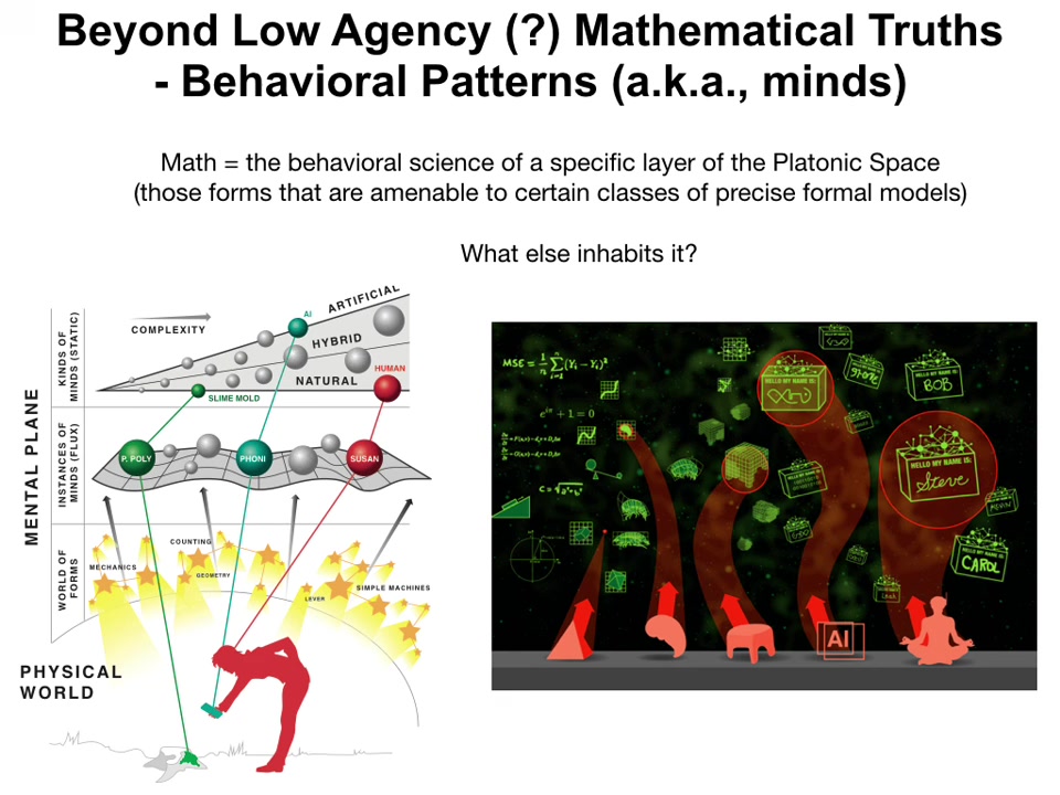 But one thing we can do is we can ask, what else might be in that space? If there are — let's assume for now that what mathematics is — it's a behavioral science applied to one specific layer or one specific region of this Platonic space. It's the science of the behavior of low-agency forms that are amenable to certain classes of precise formal models.