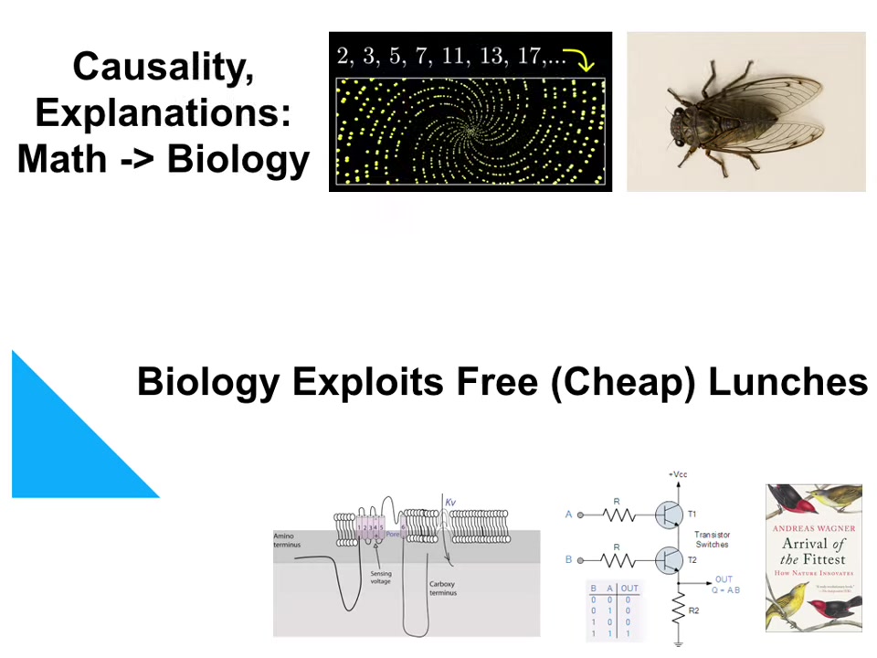 There's this idea of causality. It's difficult to talk about traditional causality because I don't know how to do time in this case. Instead, if we think about interventions. If somehow the distribution of primes were different and it wasn't 13 and 17 that were prime but something else, then that is what the cicadas would be doing. In other words, the behavior of the biology is driven by the properties of mathematics, not the other way around.