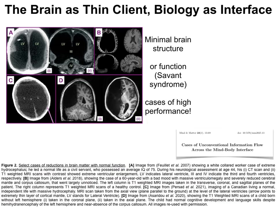 This is, and you can see these cases reviewed in this paper, this idea of even the brain as a thin client. There are rare humans with extreme lack of brain matter and yet normal or even above normal IQ.