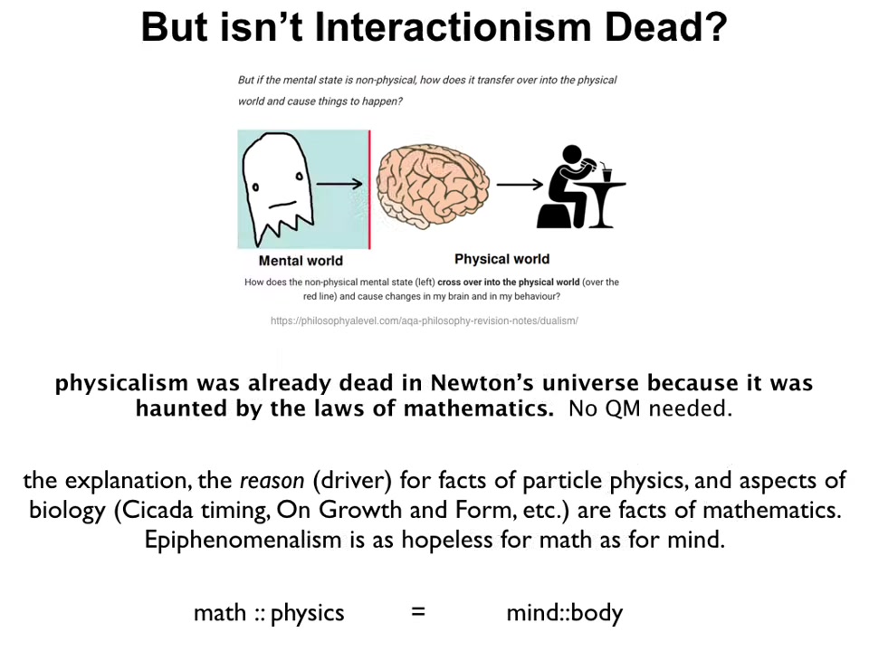 So we already knew that this was the case. And what if the mind-body relationship is basically the same as the math-physics relationship? In other words, in order to understand how minds supervene on bodies, we can take our cue from, and granted, I think there's a lot we don't understand here, but I do think the shape of the problem is roughly the same.